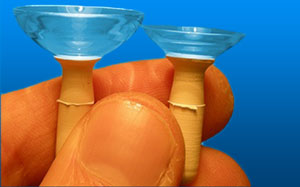 Kontaktní čočky jsou vyráběny pouze z kvalitních materiálů, které objednáváme ve formě tablet (viz. obrázek vpravo) v Kanadě a Anglii. Kontaktní čočky jsou ze základního materiálu kompletně zhotovovány až v Optické Laboratoři dle potřebných parametrů a to formou soustružení s následným důkladným leštěním. Vyjímku tvoří čočky sklerální, kde je nejprve základní tvar vylisován dle nejpodobnější šablony a až potom následuje další opracování na přesně zadané hodnoty.