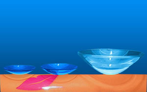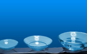 Čočka korneální průměr 9,4 mm a 11,0 mm a čočka minisklerální (20 mm) vedle sebe |